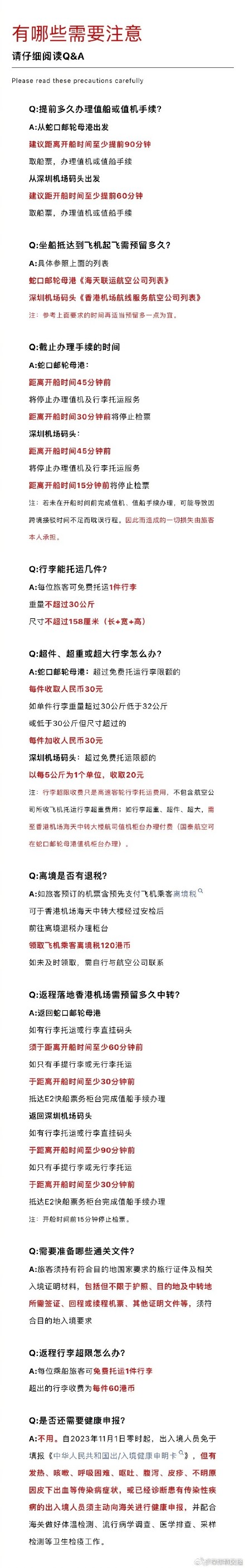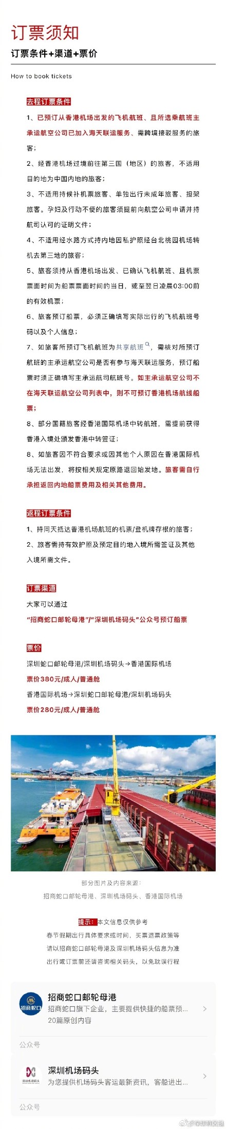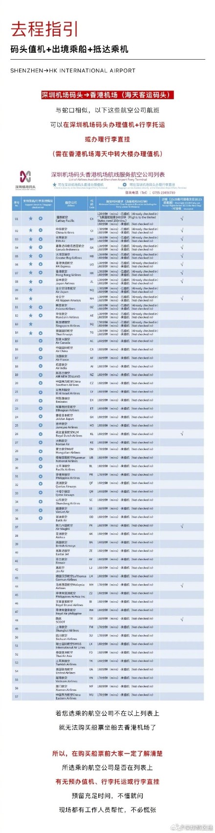 春节假期即将来临,很多小伙伴都搓搓手期待假期出行了。计划通过香港机场出境游玩的朋友们请看过来,深圳香港机场除了可通过陆路口岸外,还可以坐船抵达,码头可值机、行李直挂,一路轻松;便捷通关,人少且路程时间短。那么深圳坐船到香港机场出境需要注意什么?预定的航班有无预办值机、行李托运或行李直挂?这份指引速速转存码住。