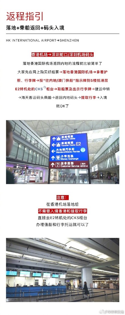 香港机场深圳蛇口/深圳机场码头:先在网上购买好船票落地香港国际机场拿着护照、行李牌按“往内地/澳门快船”指示牌到5楼抵港层E2转机处的CKS柜台取船票及出示行李牌捷运中转海天客运码头乘船返回内地码头提取行李入境。请注意,在香港机场落地后不需要入境香港和提取行李,直接去E2转机处的CKS柜台办理值船和行李托运即可。@深圳交通