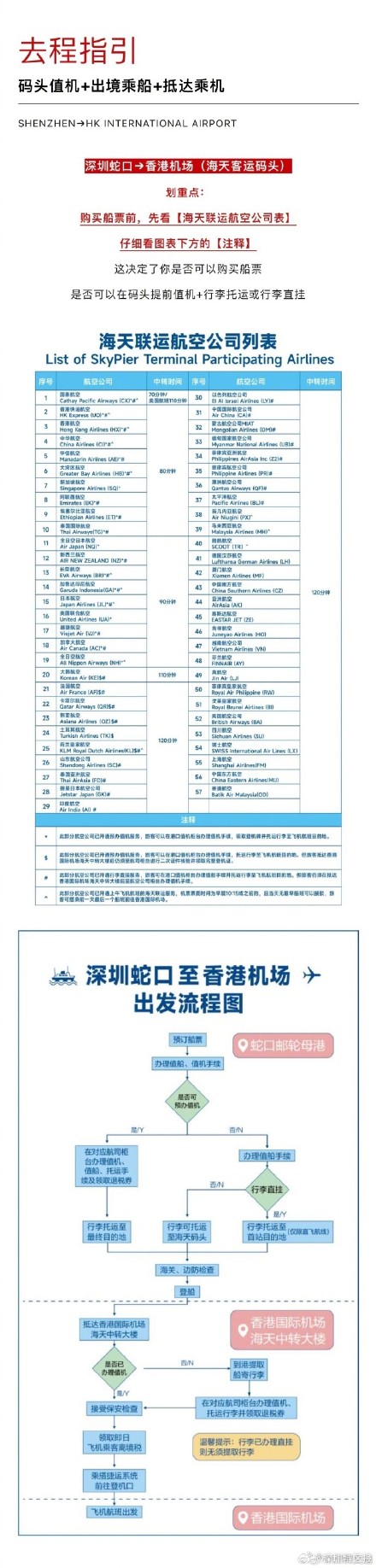 深圳蛇口邮轮母港香港机场:单航程约30分钟,购买船票前,请先查看『海天联运航空公司表』,仔细看图表下方注释哦,这决定了你是否可以购买船票+是否可以在码头提前值机以及行李托运或行李直挂。